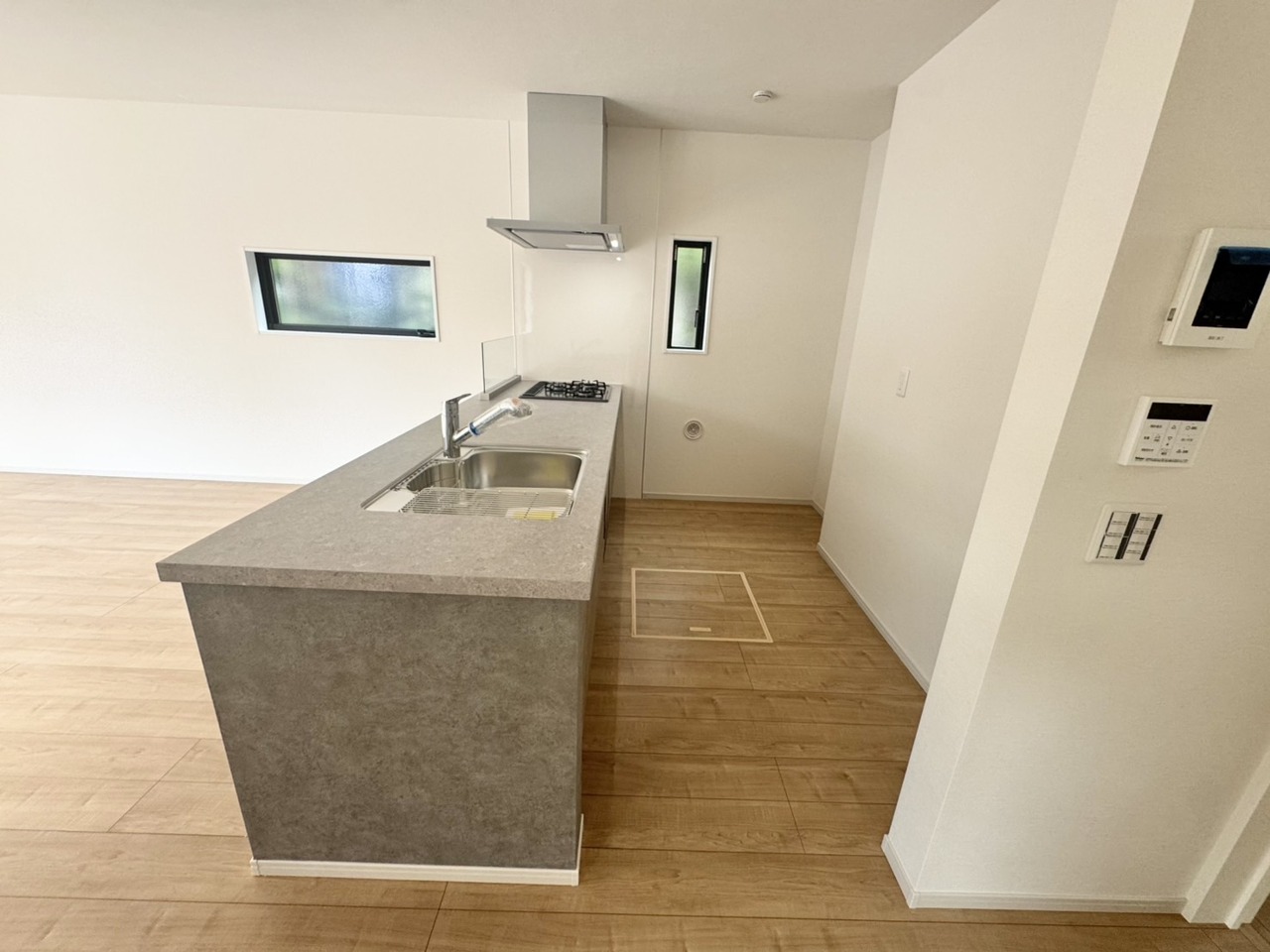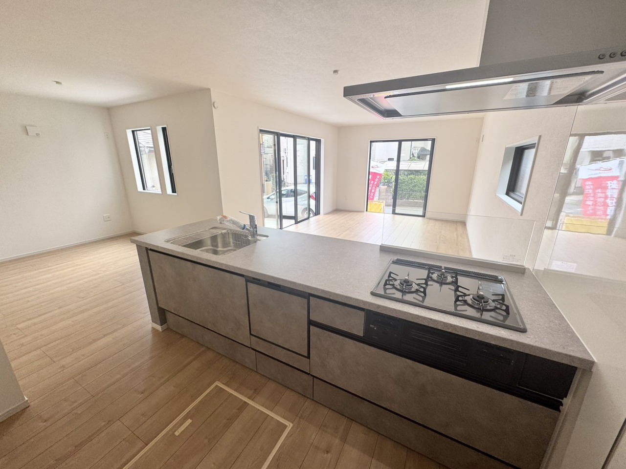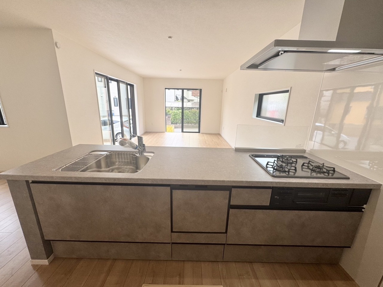 広々とした空間に、美しく調和したシステムキッチンが溶け込む。機能性と美しさが共存する、理想的な空間です。
