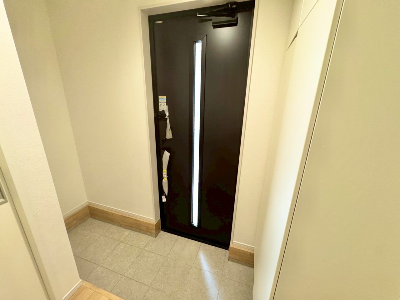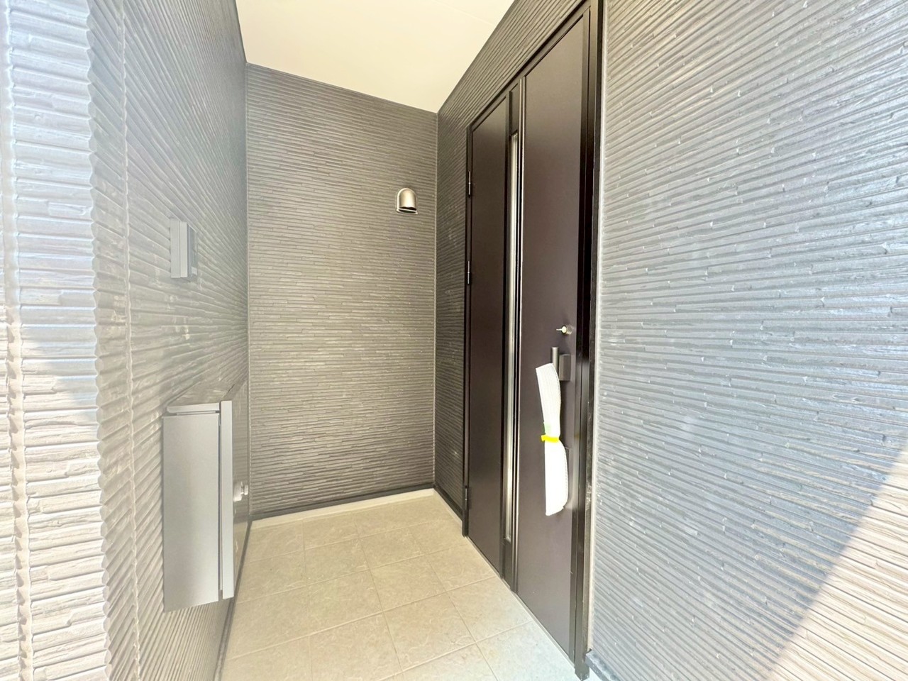 グレーの壁とタイル床が調和した、清潔感のあるエントランス。ベビーカーや荷物の出し入れもスムーズです