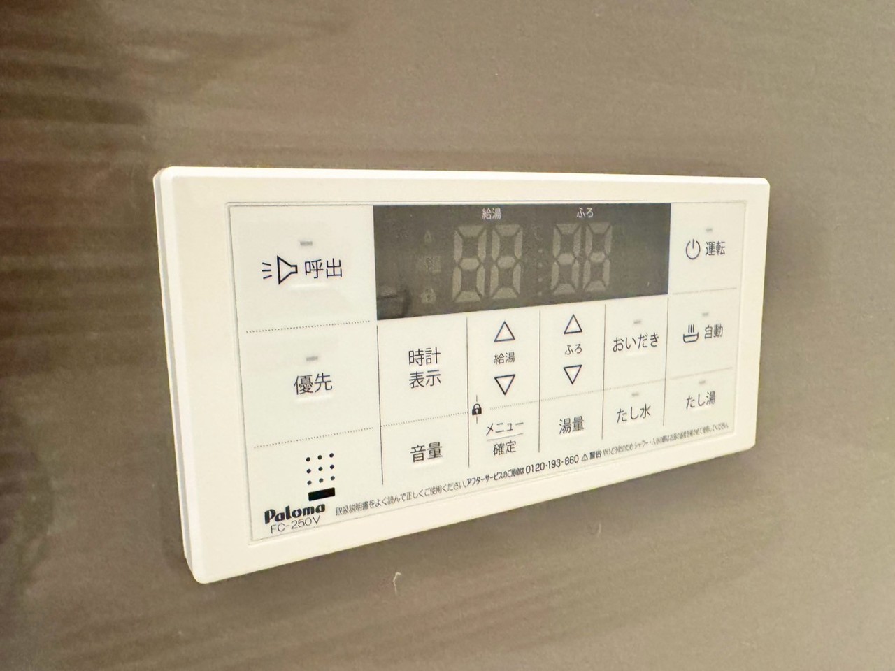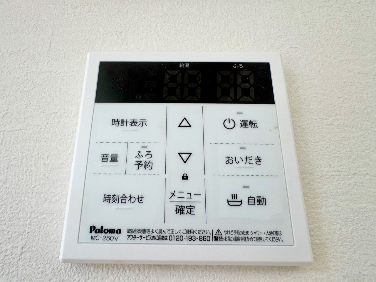 浴室には給湯リモコン付き。追い焚きや湯量調整もボタンひとつで快適に