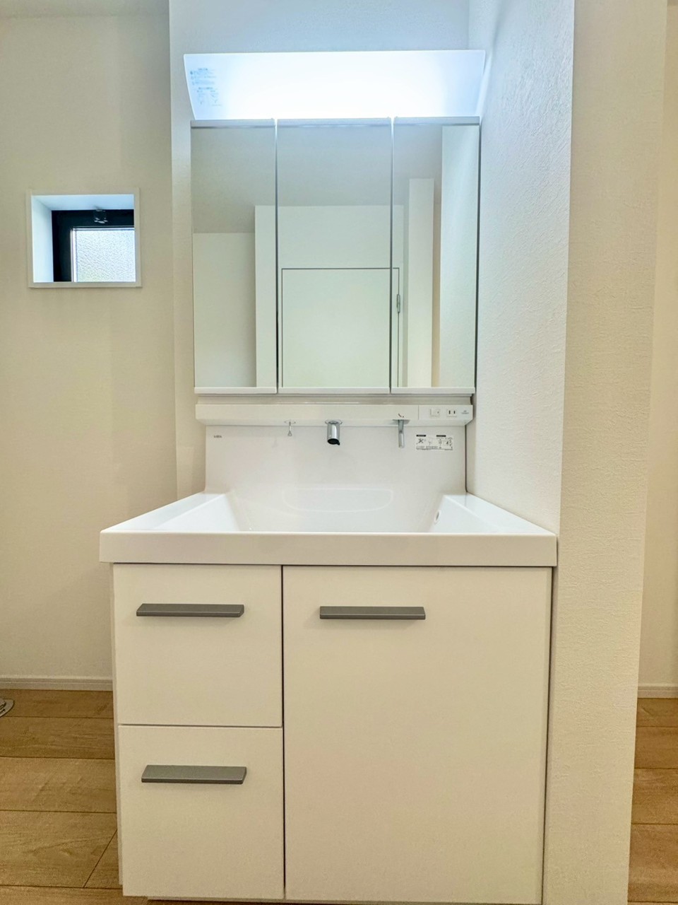 三面鏡付きシャンプードレッサーはミラーキャビネットで細かいものもスッキリ収納。大型のボウルで使いやすく手洗いしたいお洗濯にも便利です。