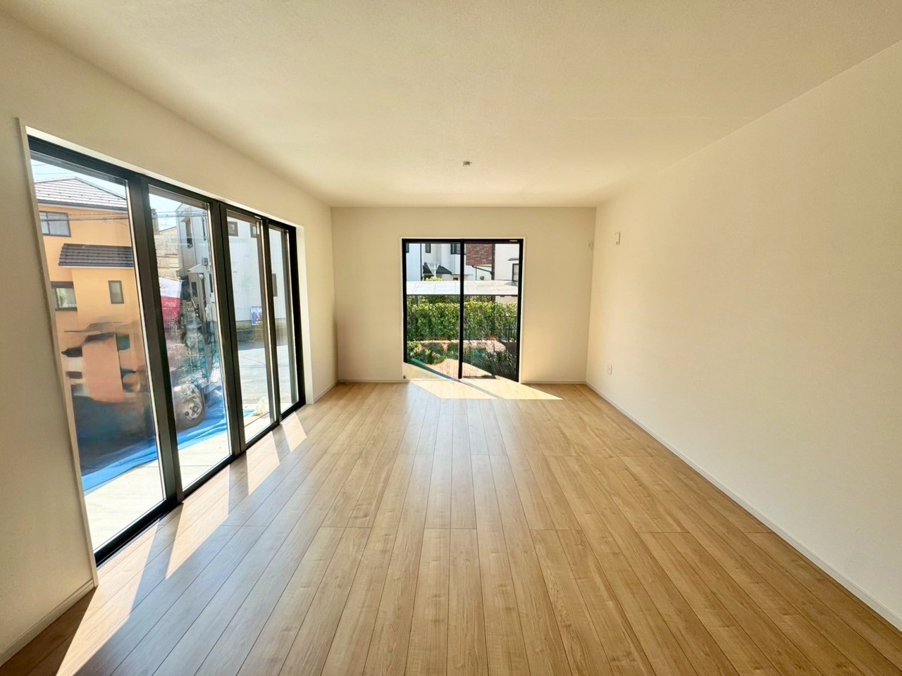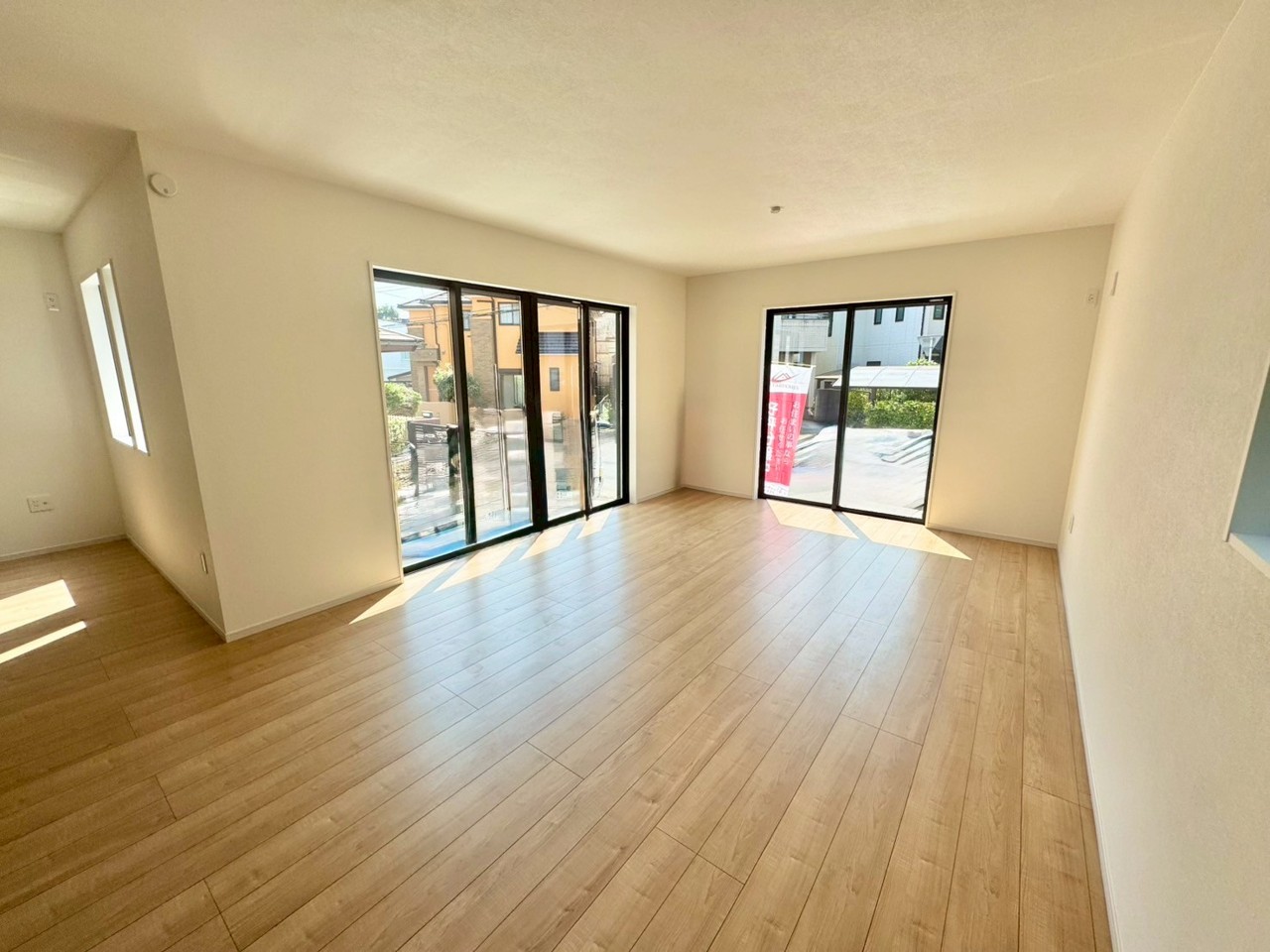 大きな窓から光が差し込む、開放感あふれるLDK。家族の時間が自然と集まる心地よい空間です