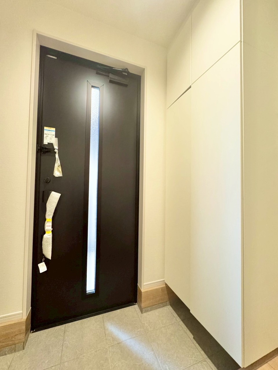 縦型のすりガラスからやさしい光が差し込む、明るく開放的な玄関スペースです