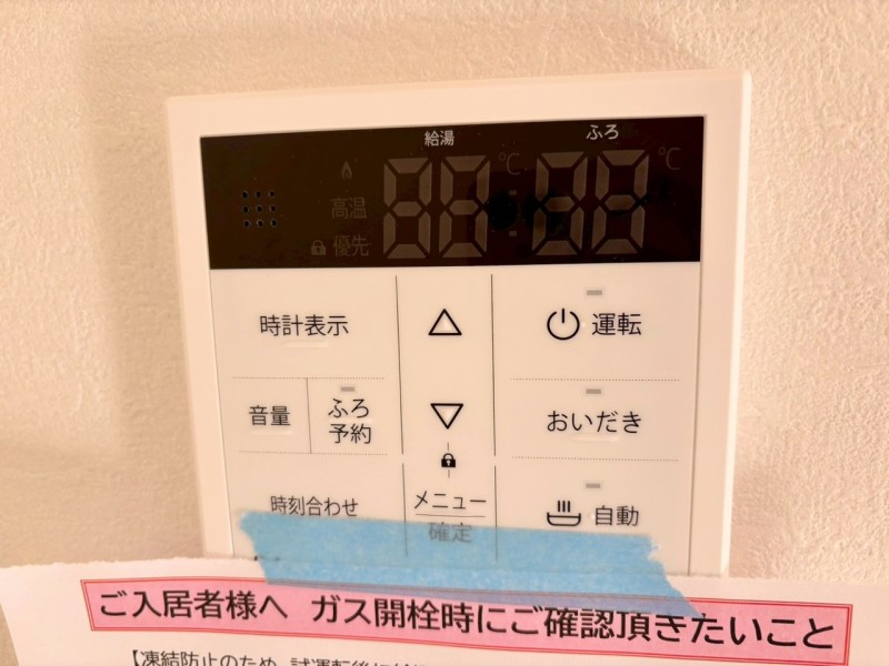 壁付けの給湯パネルは、ふろ予約や追い焚きもボタンひとつで簡単操作。シンプルなデザインで使いやすさに優れています。