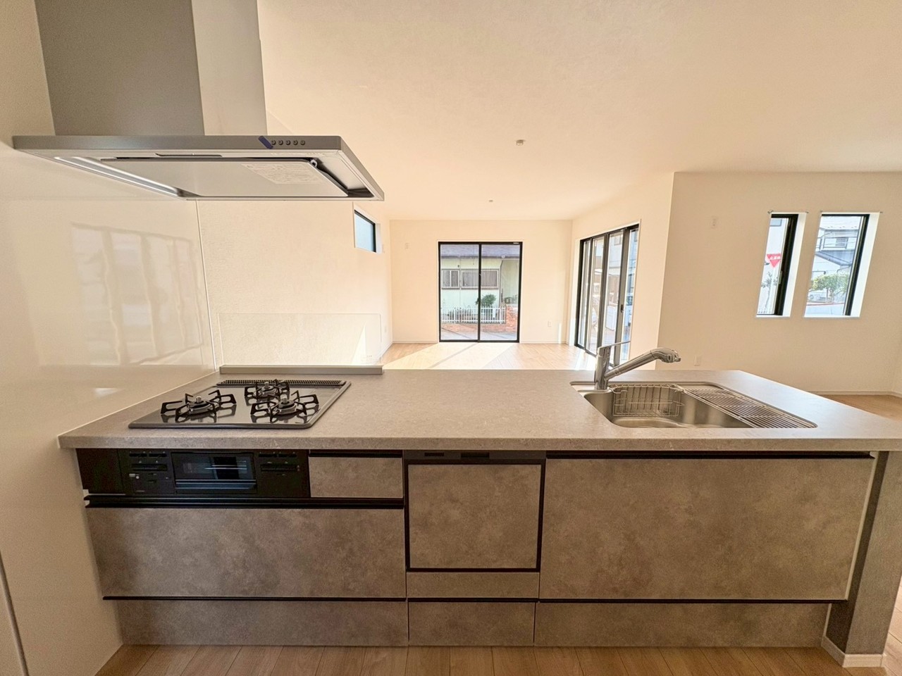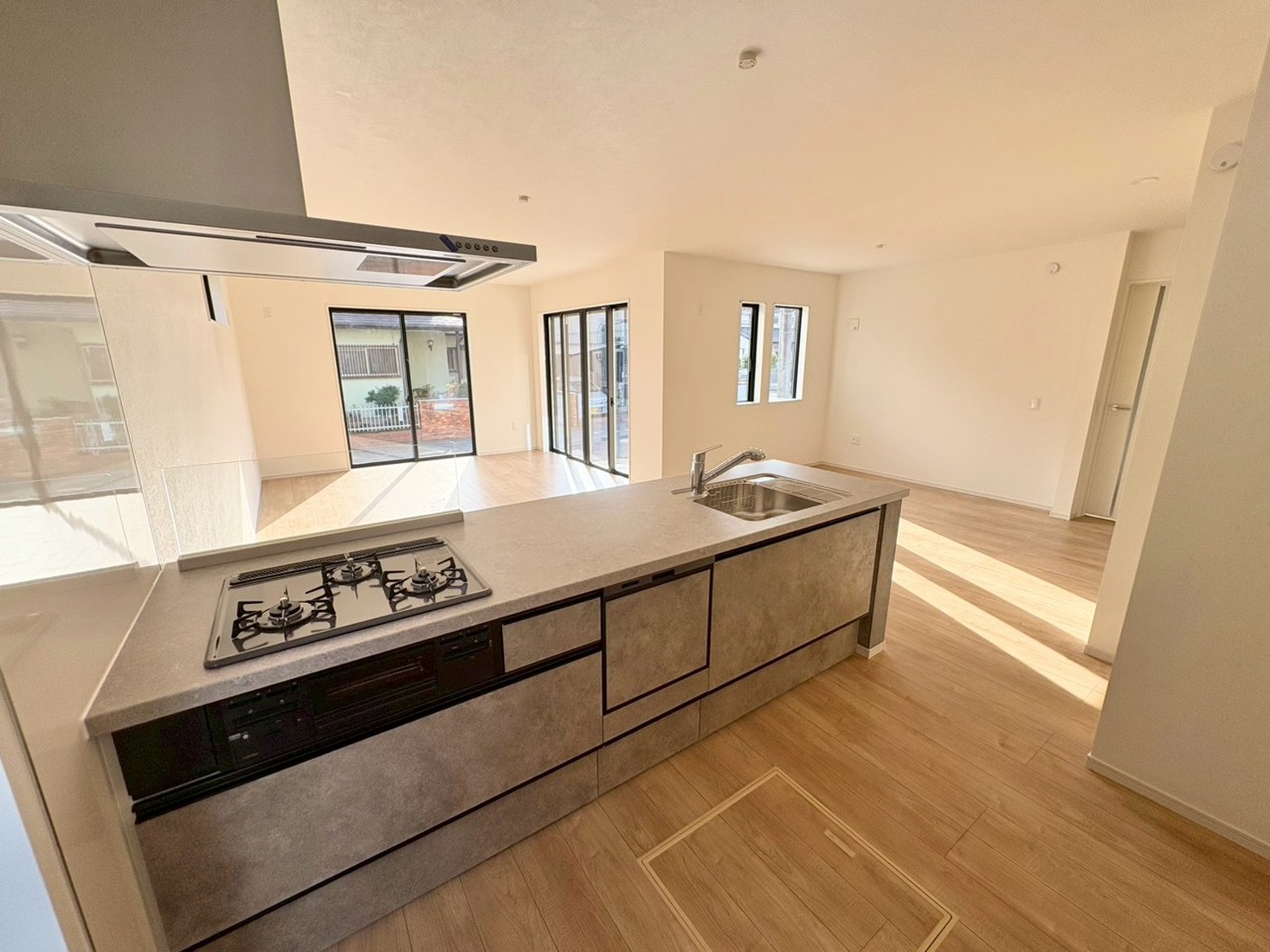 広々とした空間に、デザイン性の高いシステムキッチンが美しく調和。機能性と美しさが両立した、心地よいキッチンです。