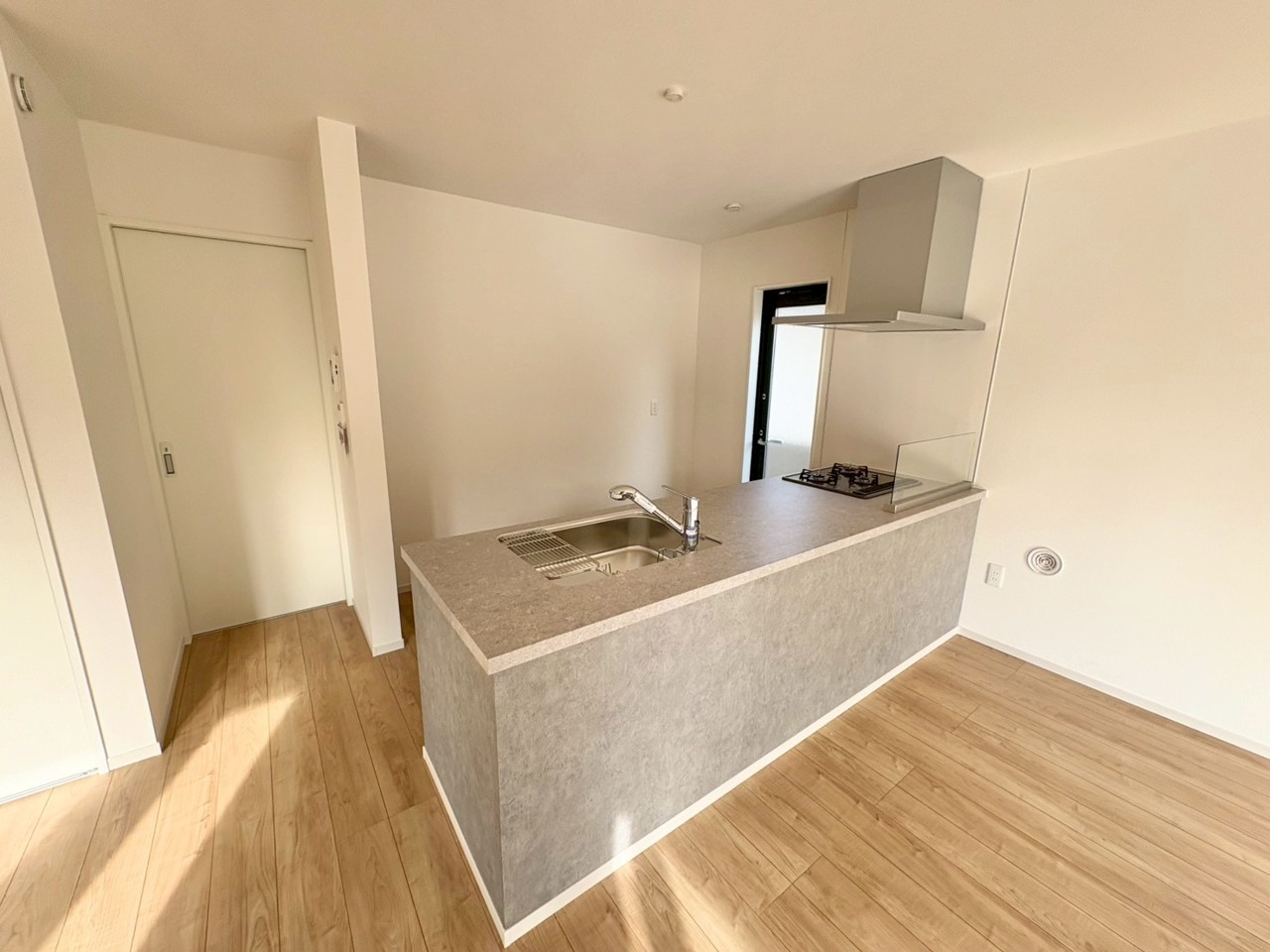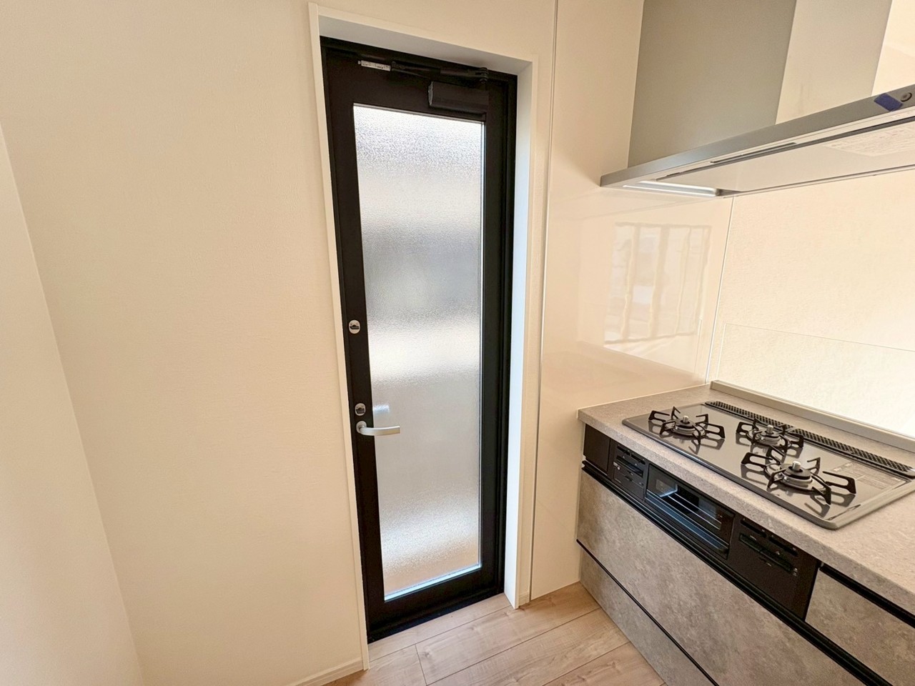 勝手口付きのキッチンコーナーは、換気や動線に便利。3口ガスコンロも備え、家事をスムーズにこなせる明るいキッチンです。
