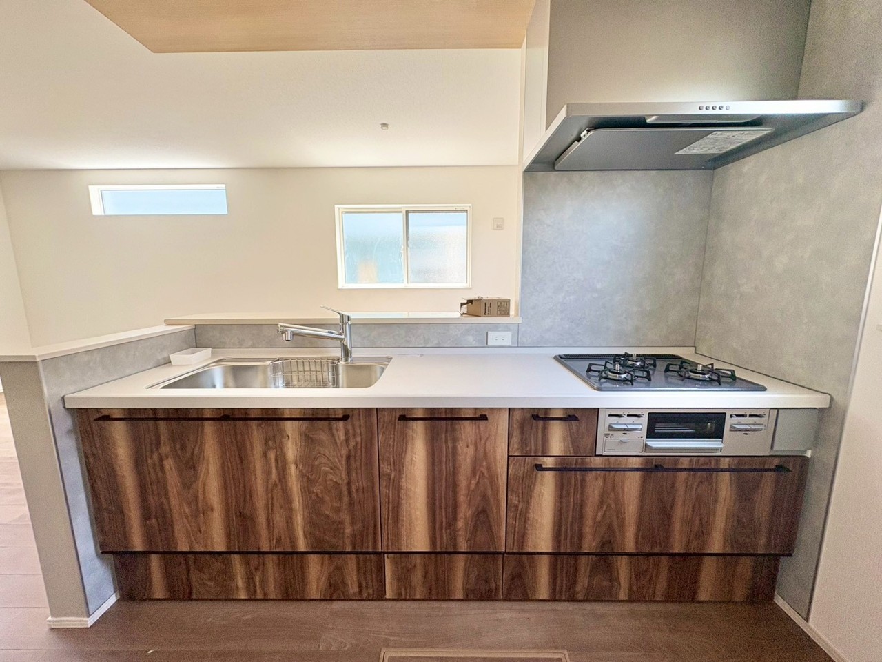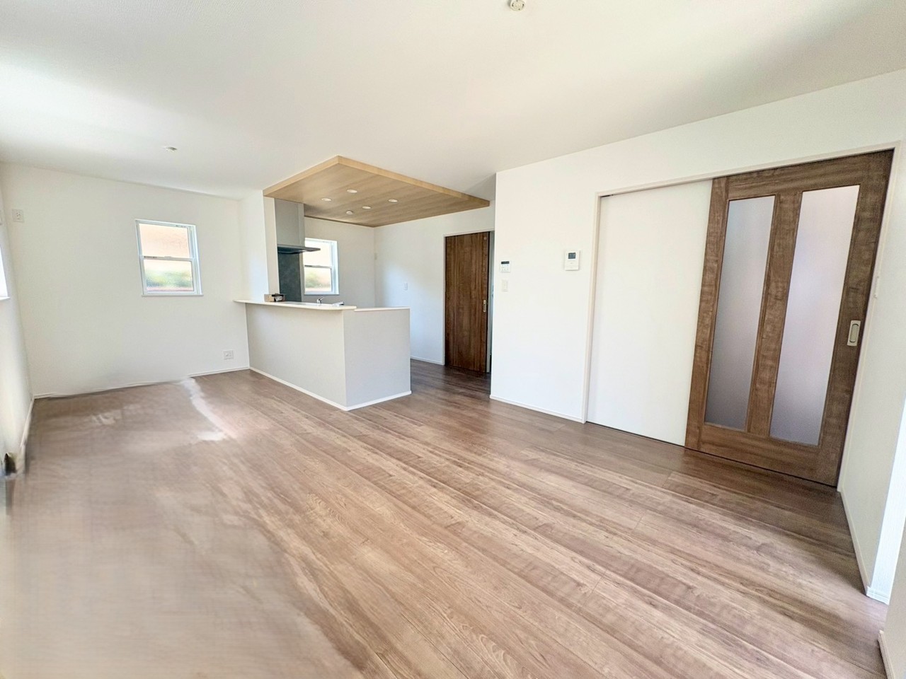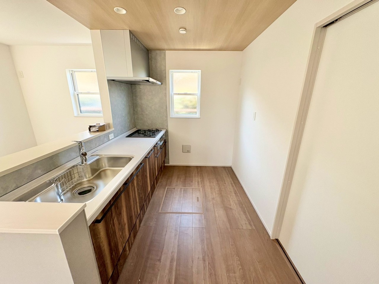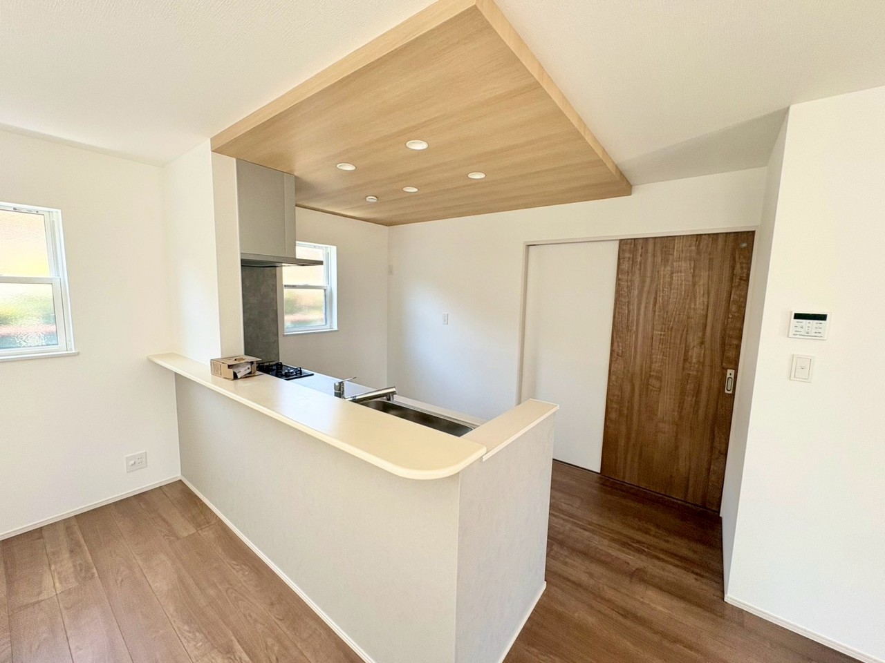モダンで機能的なシステムキッチンには対面式カウンターを採用。家族や友人と会話を楽しみながら調理ができる、うれしいレイアウトです。 温もりある木目天井と、自然な色合いの床材が織りなす、穏やかで洗練された空間。生活感を感じさせない、すっきりとした設えがお出迎えします