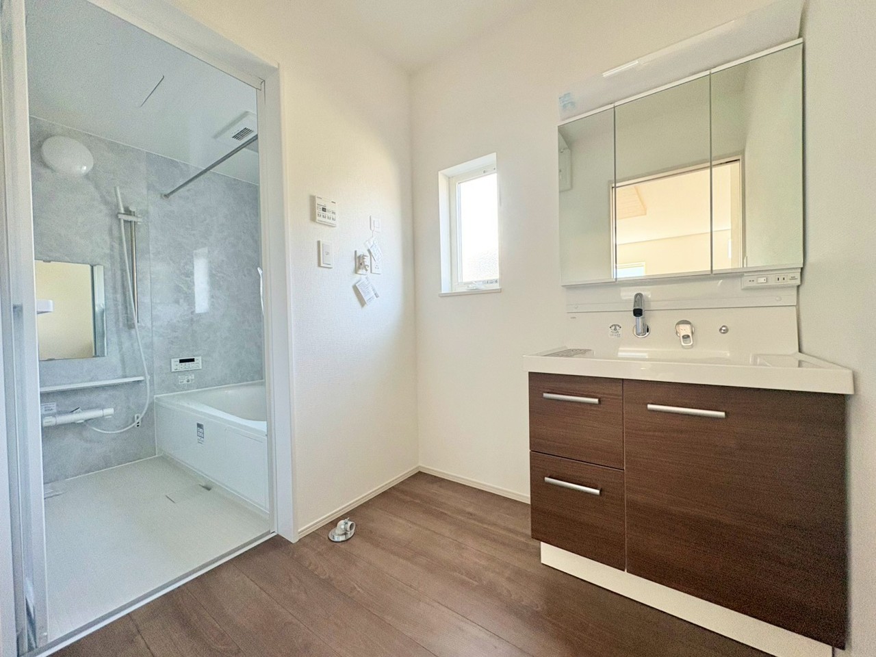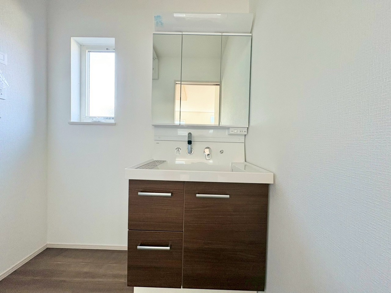 窓から自然光が差し込む洗面室。明るく清潔感のある空間で、毎日の身支度を気持ちよく行えます。