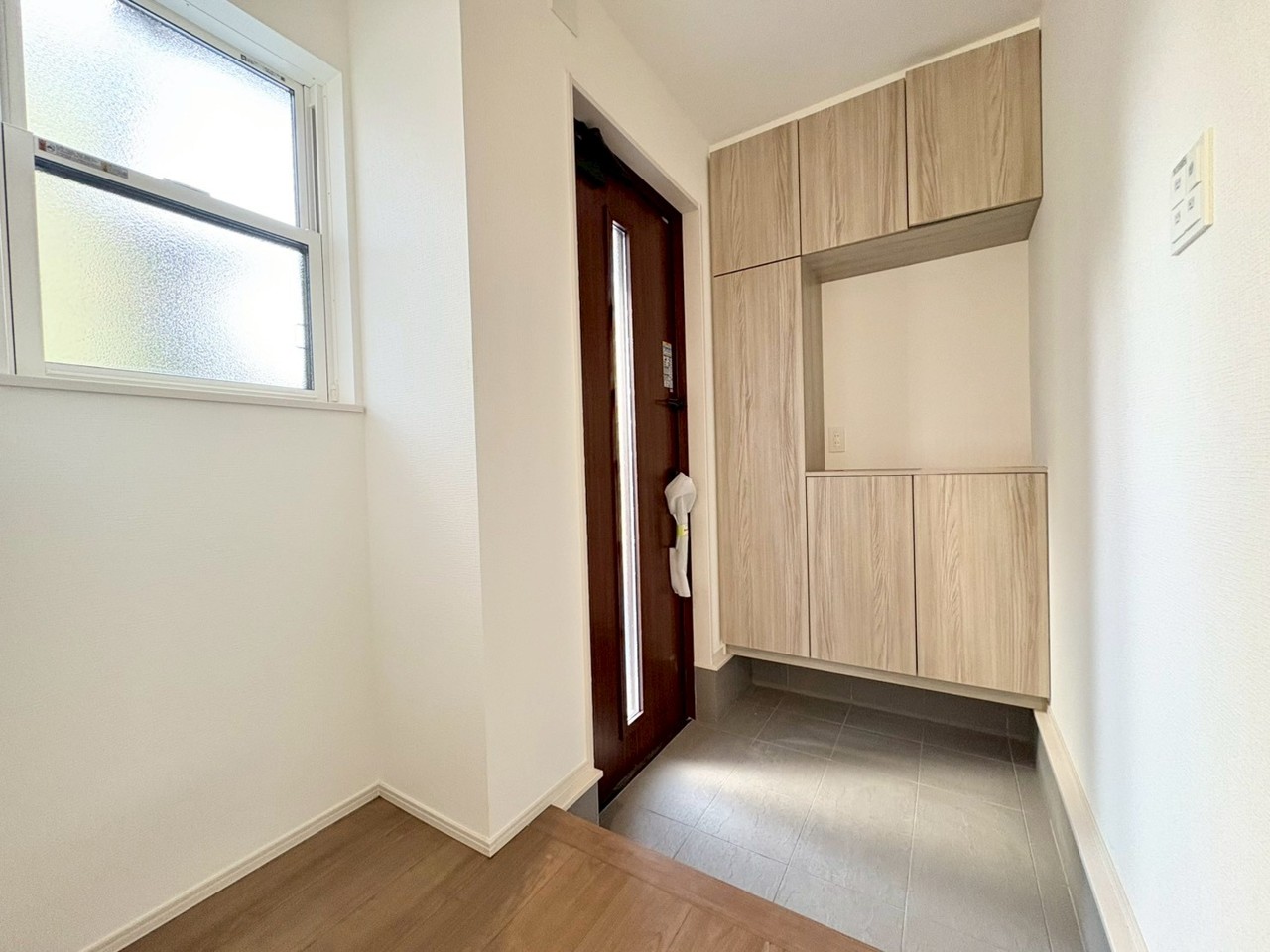 広々とした玄関には、大容量のシューズ収納と飾り棚を備えています。使いやすさと美しさが調和した、心地よい空間です。