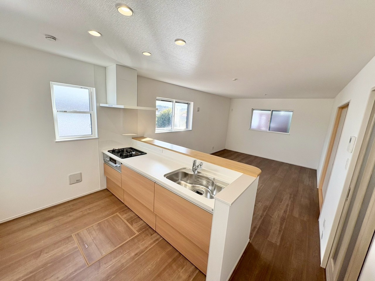 モダンで機能的なシステムキッチンには対面式カウンターを採用。家族や友人と会話を楽しみながら調理ができる、うれしいレイアウトです。