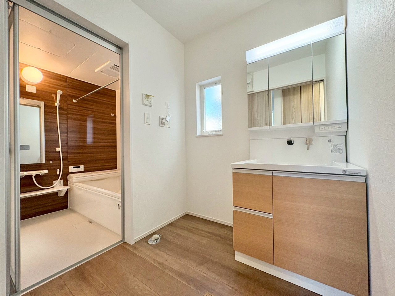 窓から自然光が差し込む洗面室。明るく清潔感のある空間で、毎日の身支度を気持ちよく行えます。