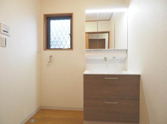 窓から自然光が差し込む洗面室。明るく清潔感のある空間で、毎日の身支度を気持ちよく行えます。
