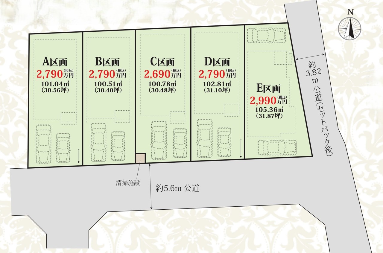| 土地面積 | 100.51m² ~ 105.36m² 実測 | ||