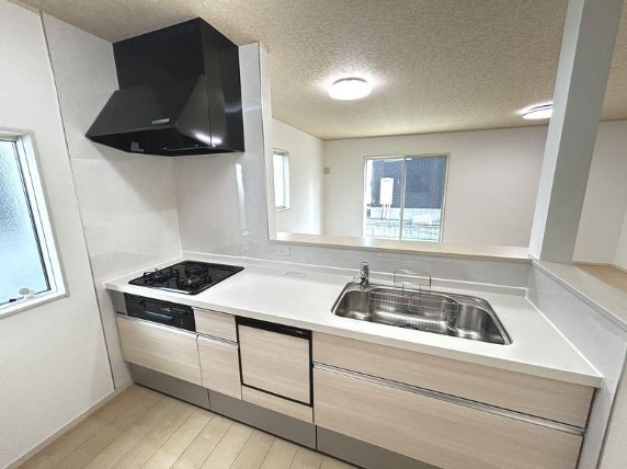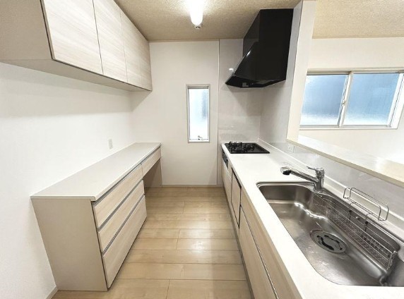 広々とした空間に、デザイン性の高いシステムキッチンが美しく調和。機能性と美しさが両立した、心地よいキッチンです。